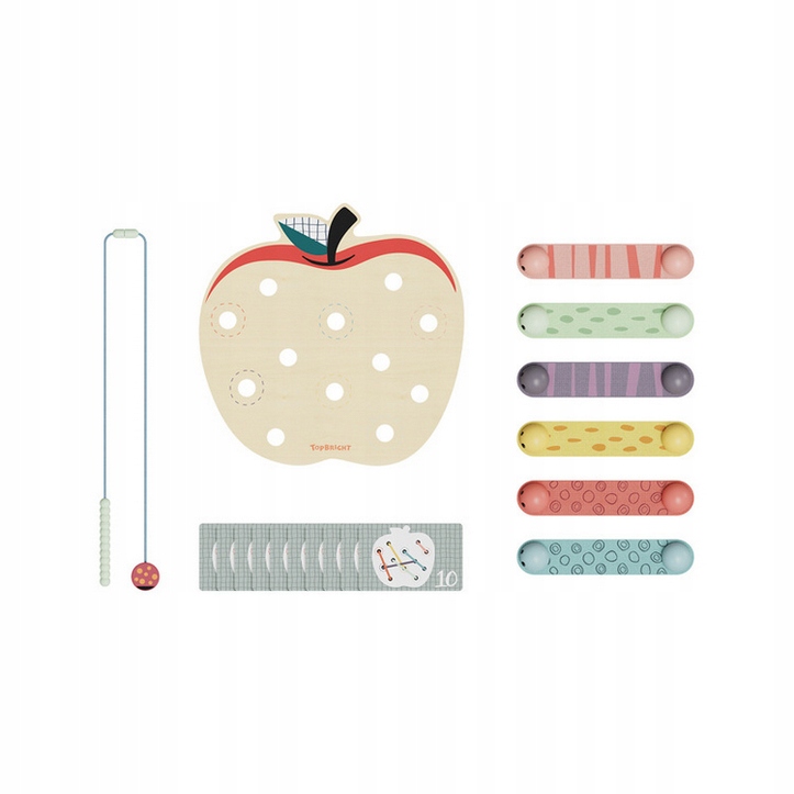 To połączenie zasad: gry w nawlekanie i gry w kołki. Dzieci albo przewlekają robaka na sznurku przez dziurki w jabłku, albo wkładają kolorowe robaki z kołkami do otworów. Zabawka jest prosta w obsłudze ale jednocześnie stanowi wyzwanie dla małej głowy.