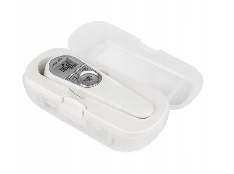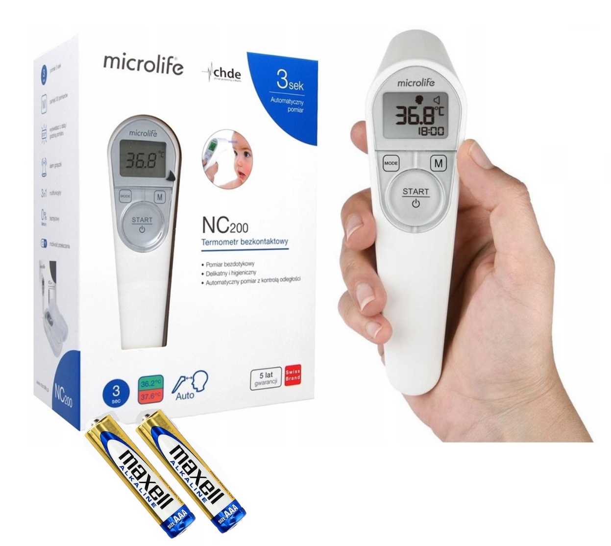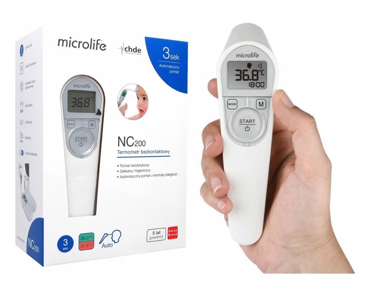 Bezdotykowy termometr NC200 umożliwiający automatyczny (po zbliżeniu do ciała na odległość 5 cm) i błyskawiczny (3 s.) pomiar temperatury. Etui i baterie w zestawie. Termometr Microlife® jest urządzeniem wysokiej jakości wykorzystującym najnowsze technologie i przetestowanym pod kątem zgodności z międzynarodowymi standardami. Dzięki wyjątkowej technologii termometr zapewnia zawsze precyzyjny i niezależny od zewnętrznych źródeł ciepła odczyt temperatury. Urządzenie przeprowadza samosprawdzenie za każdym razem, kiedy je włączasz, aby zagwarantować precyzję pomiaru.